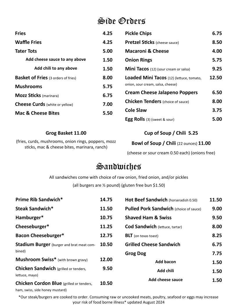 When it comes to sides, the menu shines with options like Waffle Fries ($4.25) and the extensive Grog Basket ($11.00), a delightful collection of fried goodies begging to be shared. The Macaroni & Cheese ($4.00) is a go-to comfort food which adds a touch of nostalgia with every creamy bite.