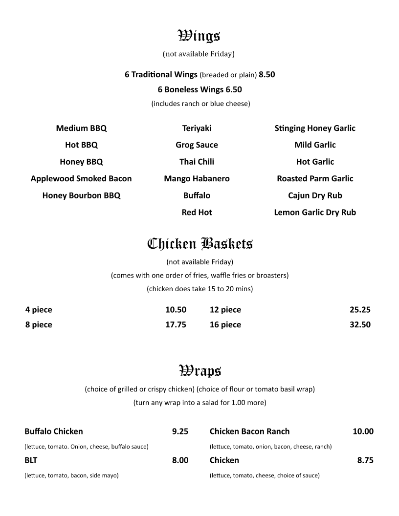 At The Old Grog, the menu is a wonderful reflection of classic American fare that doesn’t just satisfy hunger but warms the soul. From savory sandwiches like the BLT on Texas toast ($8.25) to a hearty Mushroom Swiss with brown gravy ($12.00) and an immense Steak Sandwich ($11.50), there’s something here for everyone. Vegetarian options like the Grilled Cheese Sandwich ($6.75) ensure that all diners leave happy. The hunger pangs don’t stop there—you can dive into a selection of crispy wings, available with an impressive range of sauces that span from the mild Mango Habanero to the tongue-tingling Stinging Honey Garlic.